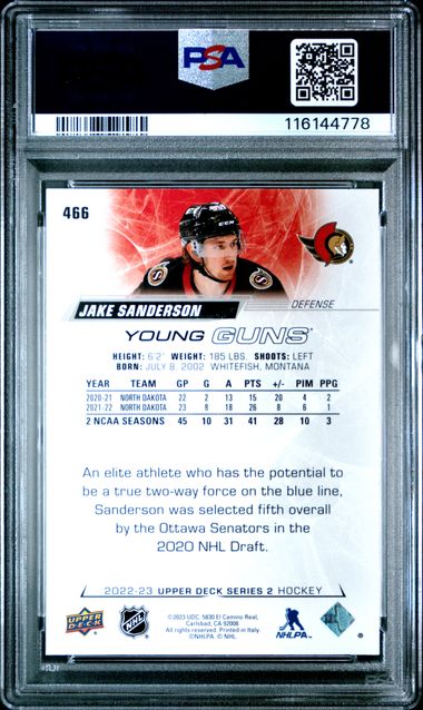 2022 Upper Deck Jake Sanderson #466 - YG Rookie - YOUNG GUNS ROOKIE - PSA