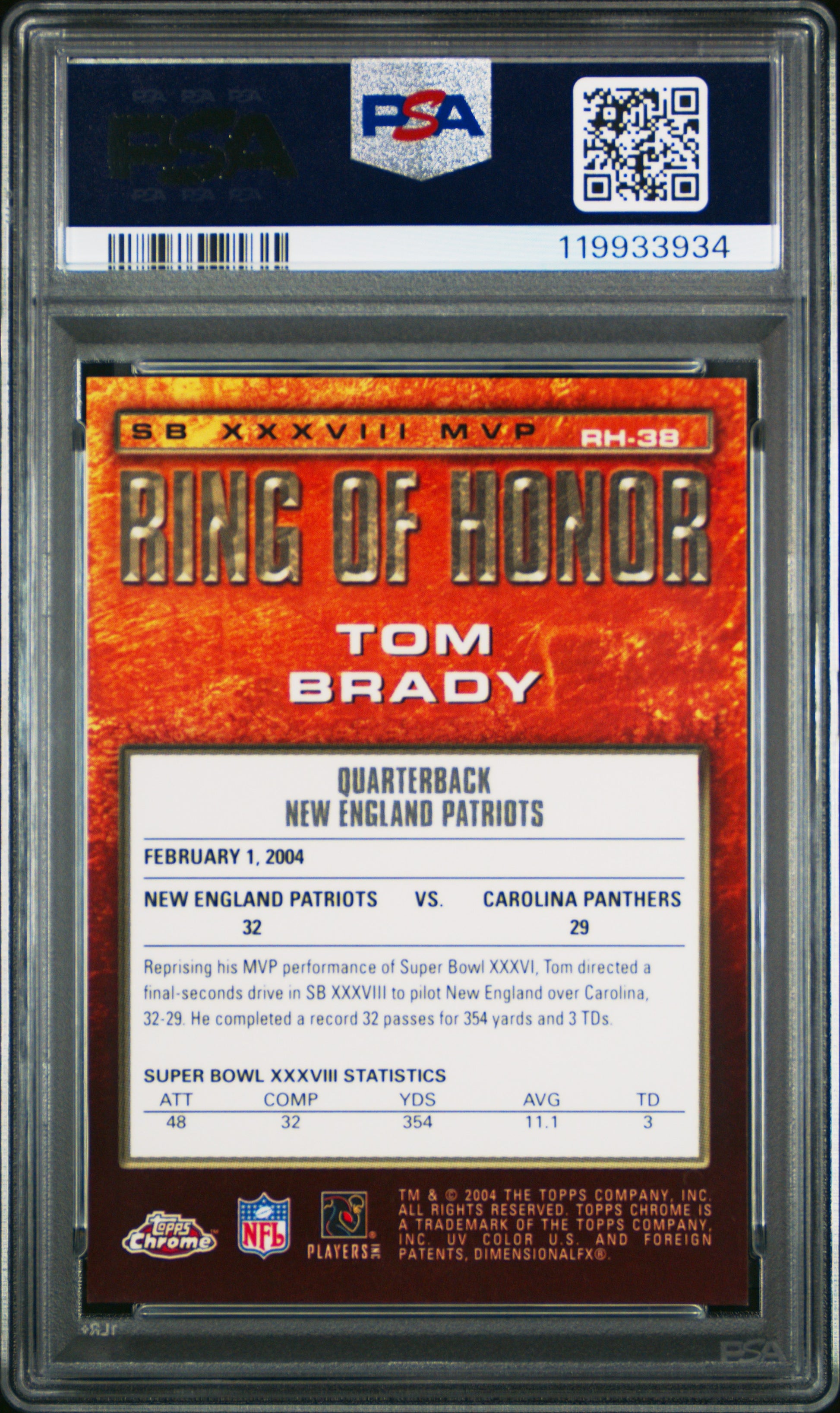 You are purchasing a 2004 Topps Chrome Ring Of Honor Tom Brady #RH-38 PSA 9. You will receive the exact item in the photographs. Thank you. Listed With Mascot.