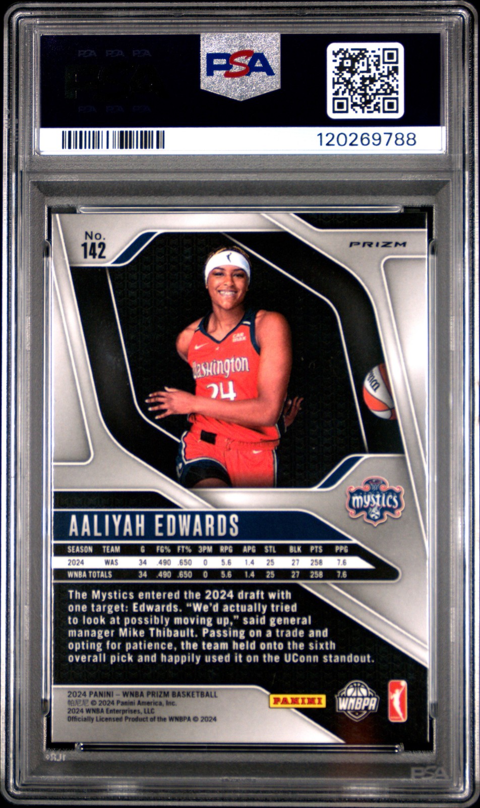 You are purchasing a 2024 PANINI PRIZM WNBA AALIYAH EDWARDS #142 SILVER PRIZM Rookie PSA 9. You will receive the exact item in the photographs. Thank you. Listed With Mascot.