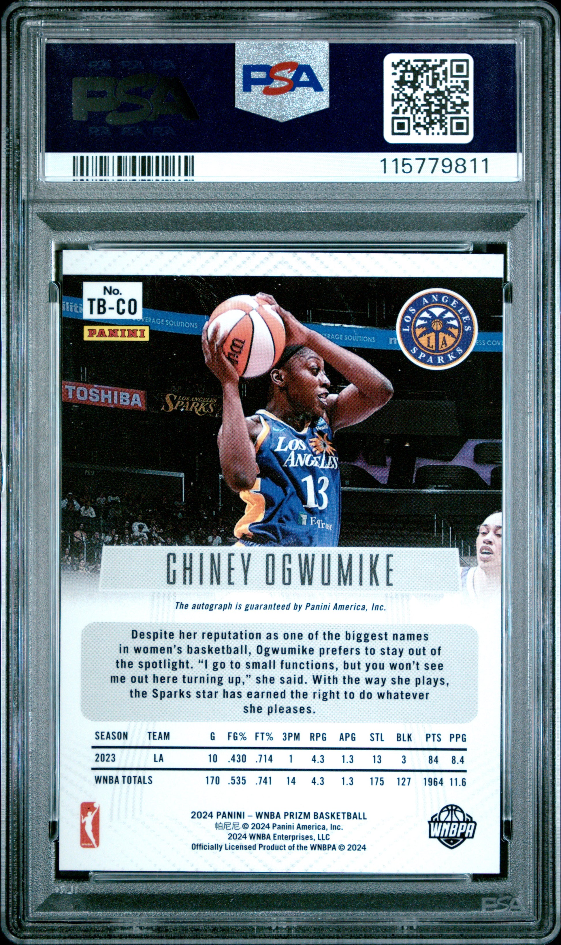You are purchasing a 2024 Panini Prizm WNBA Throwback Signatures Chiney Ogwumike #TBCO PSA 9. You will receive the exact item in the photographs. Thank you. Listed With Mascot.