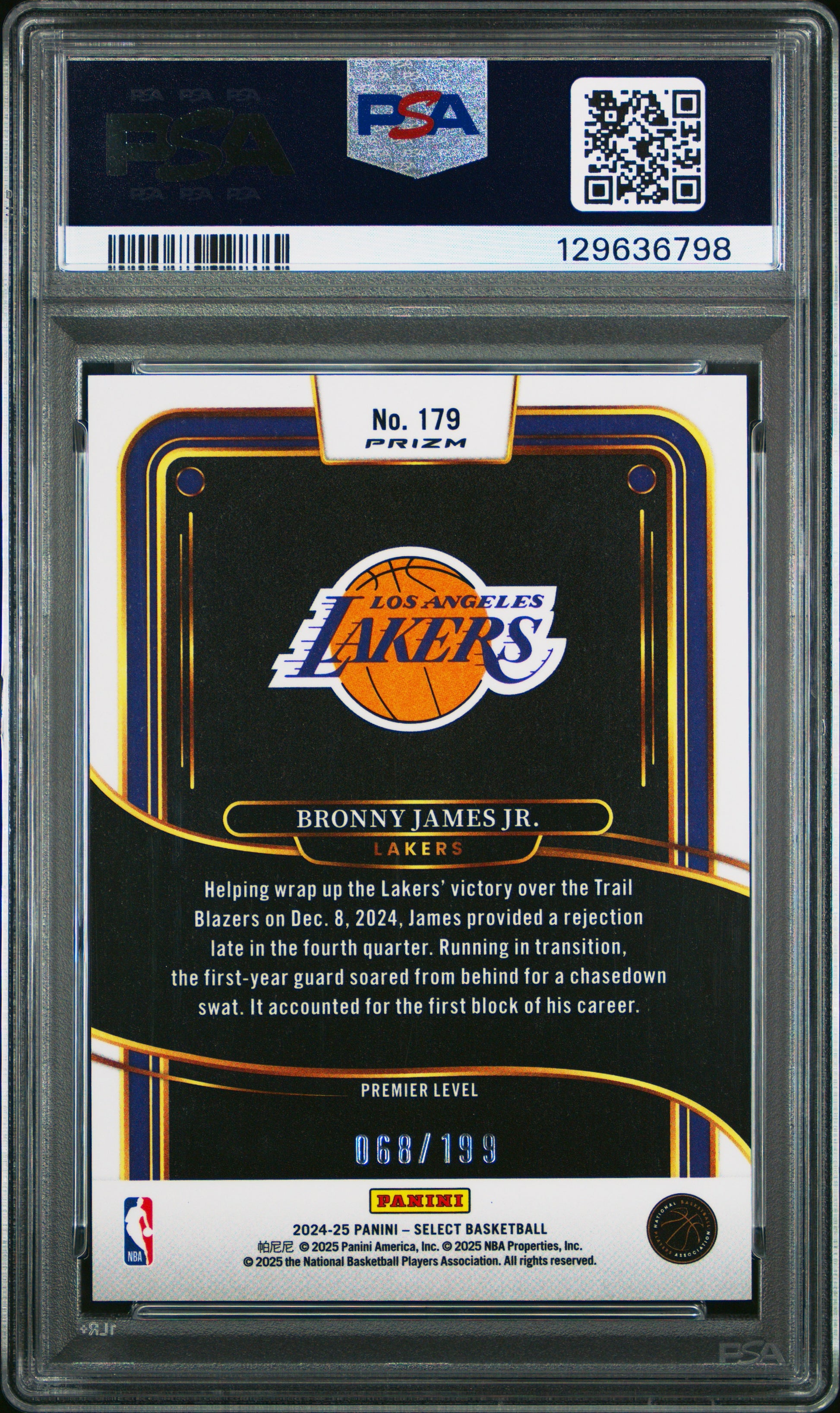 You are purchasing a 2024 Panini Select Bronny James JR. #179 Red Prizm 068/199 Rookie PSA 10. You will receive the exact item in the photographs. Thank you. Listed With Mascot.